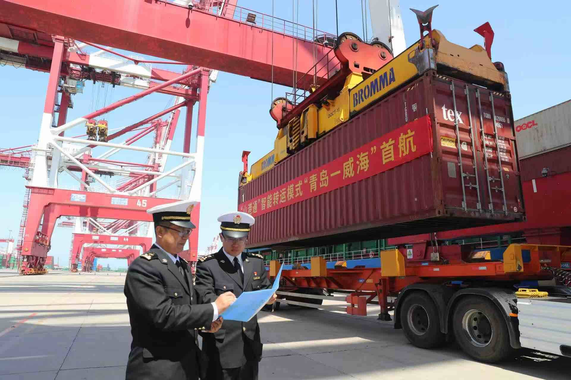“‘山港通’智能转运模式构建以青岛前湾港为核心枢纽,联动烟台、威海、日照等支线’体系,实现了港口间多类型货物智能转运监管新突破,提升船舶舱位综合利用效率20%以上。”青岛海关口岸监管处副处长罗福茂介绍。