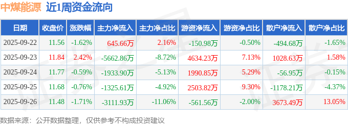 资金流向数据方面,本周中煤能源主力资金合计净流出1.14亿元,游资资金合计净流入8416.37万元,散户资金合计净流入2972.29万元。本周资金流向一览见下表: