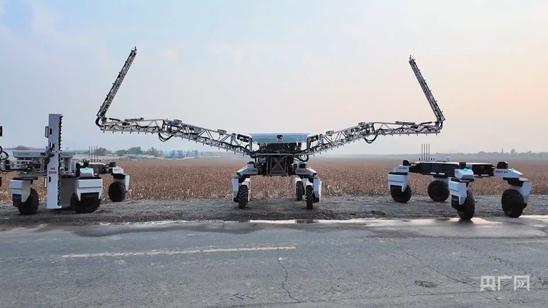 新疆“无人”智慧农场里的T3000(图中)动力惊人,它的旋转臂最长可伸展至21米(央广网发 受访者供图)